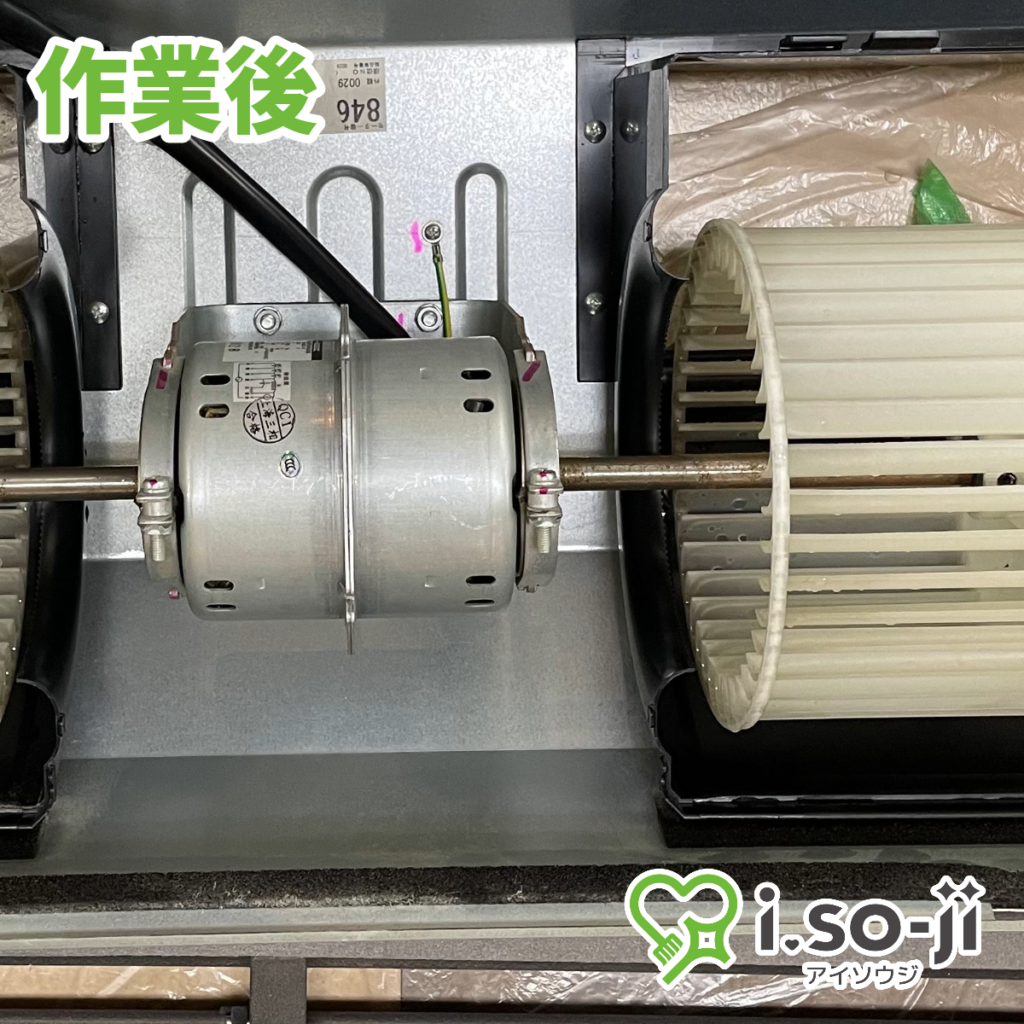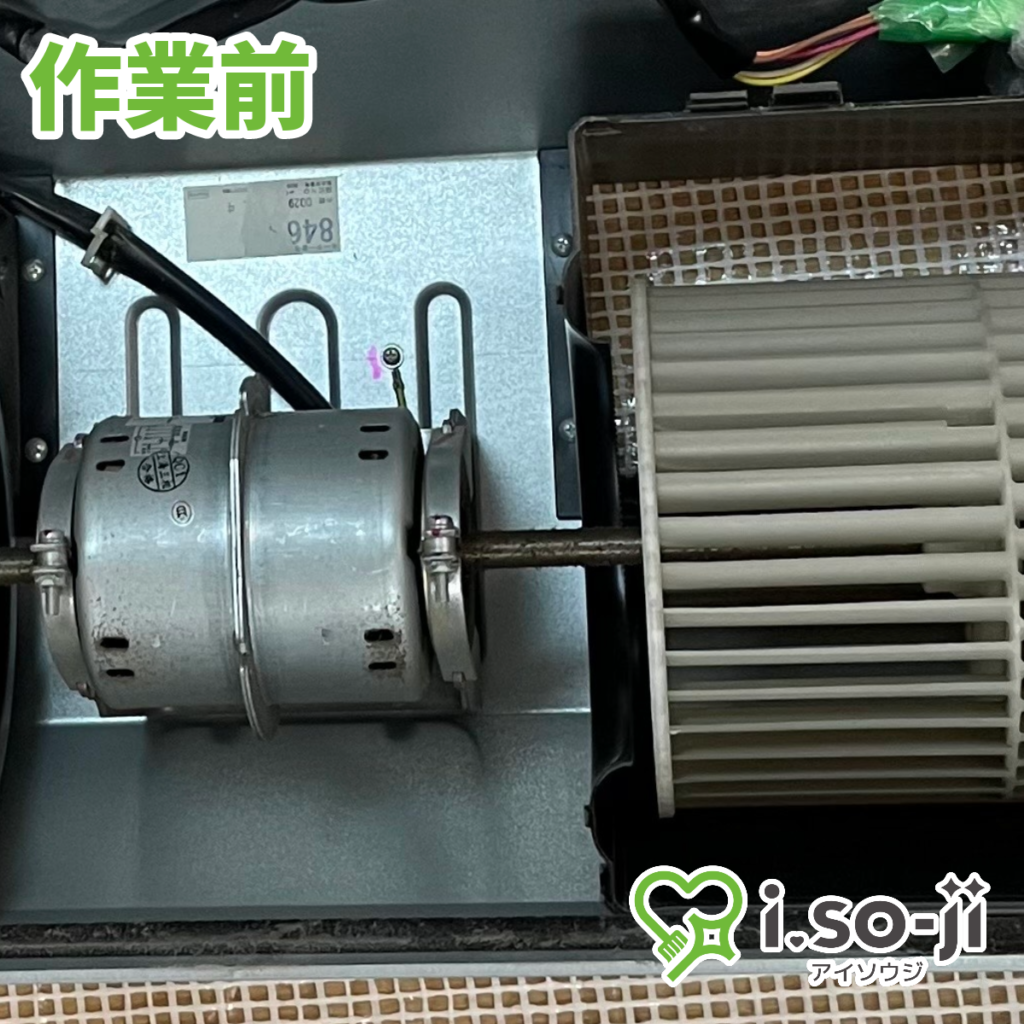 業務用の天井吊り下げエアコンです。中のファンはカビやホコリで黒くなっています。