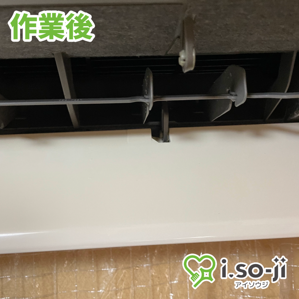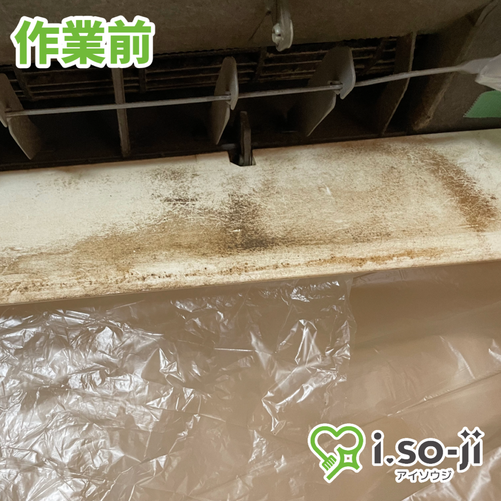 家庭用エアコンの吹き出し口です。カビ汚れがルーバーまで付いてしまい、見るからに汚れています。